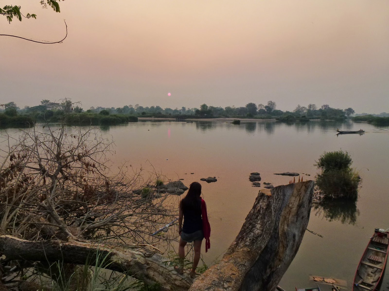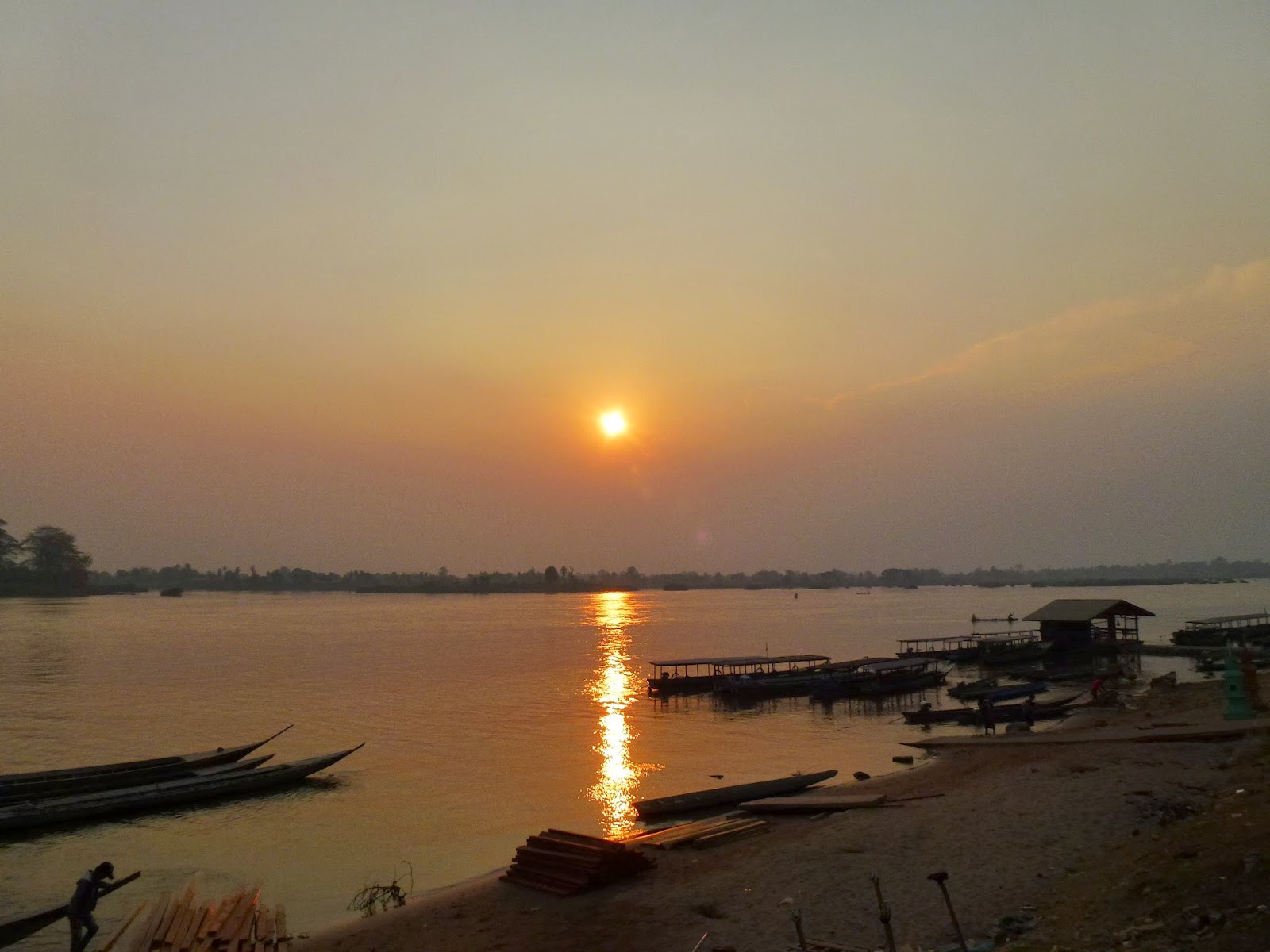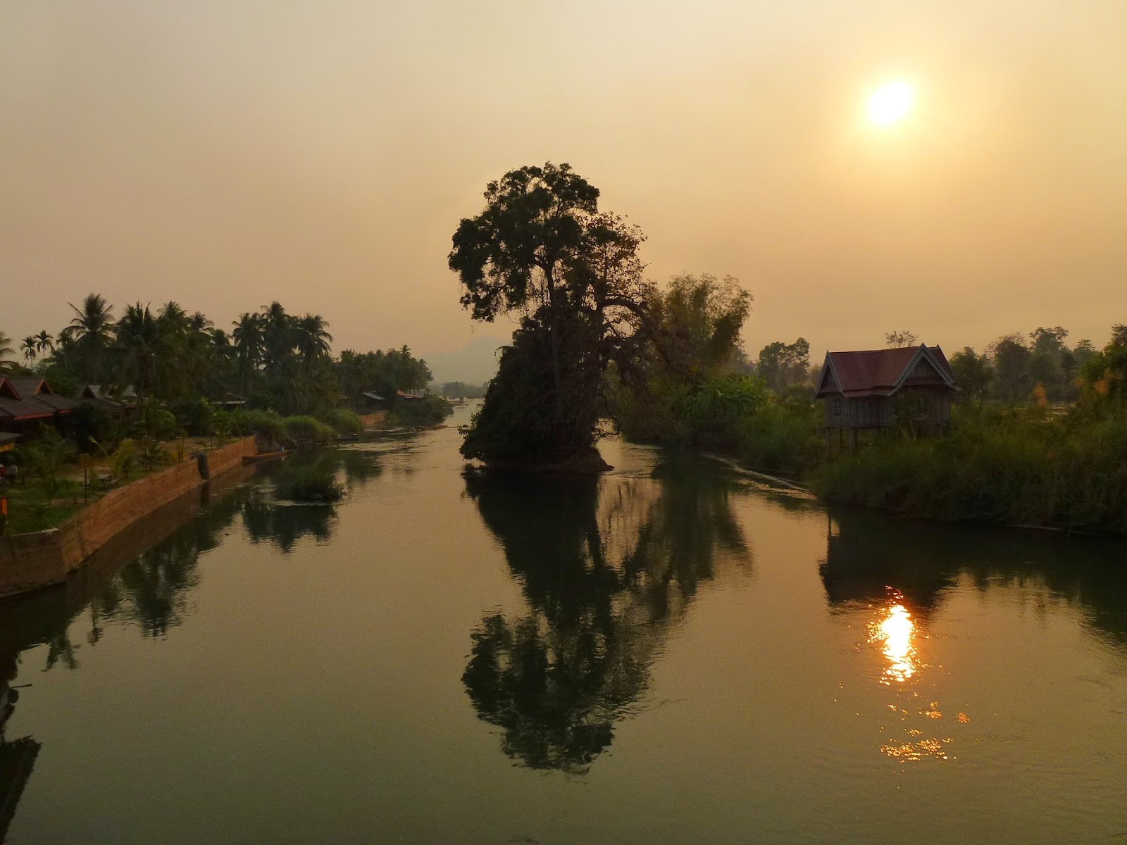 A parte de un precioso atardecer,lo primero que nos da la bienvenida, y me acompañaría durante toda mi estancia en el sur de Laos, es una humedad y un calor asfixiantes, rozando los 40 grados. Había momentos que se hacía insoportable. ¡Imagínate lo gracioso que es buscar alojamiento en esas condiciones con la mochila a cuestas!