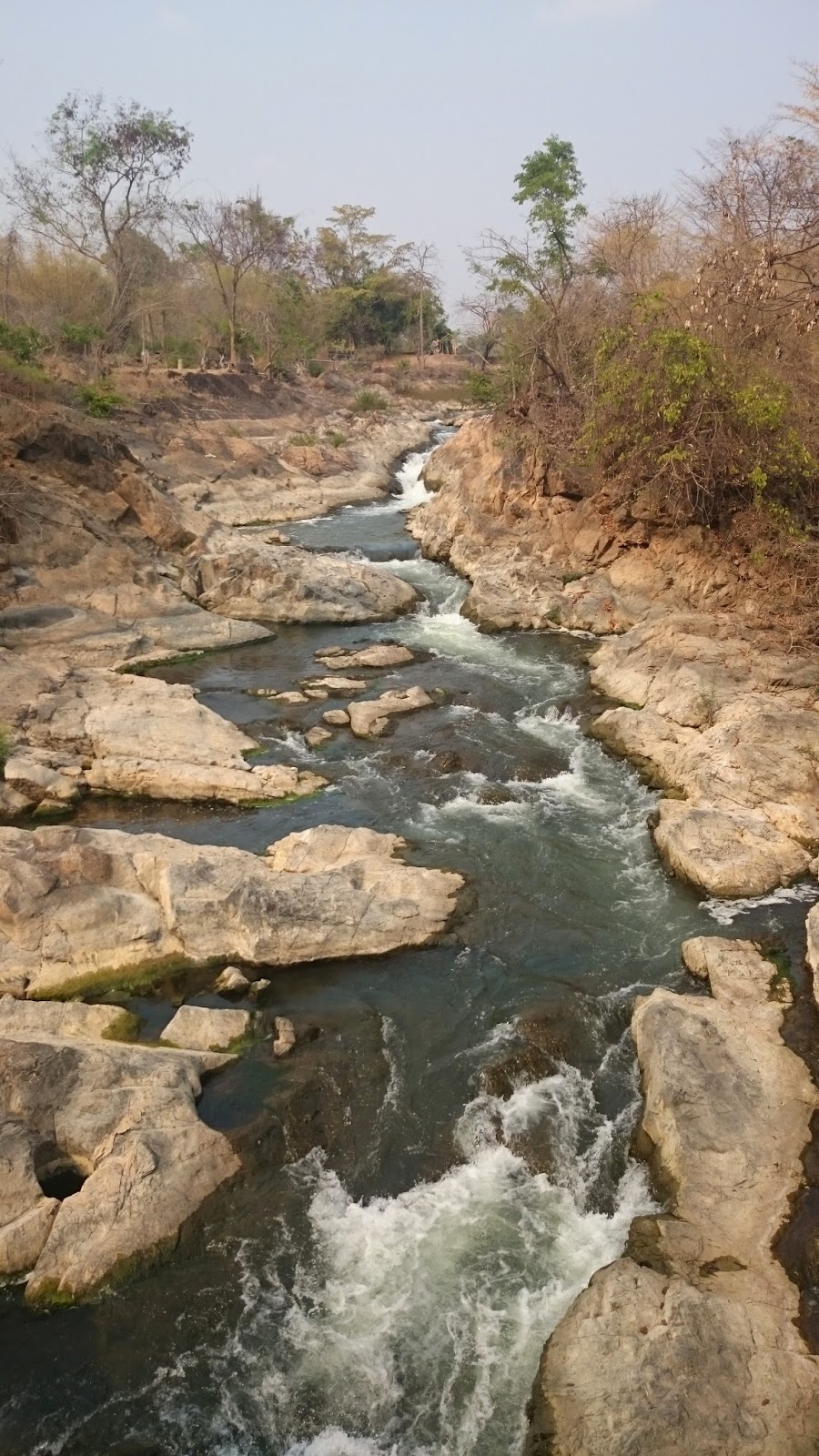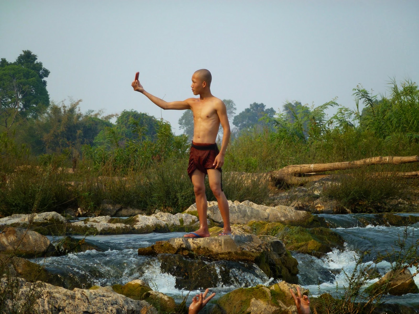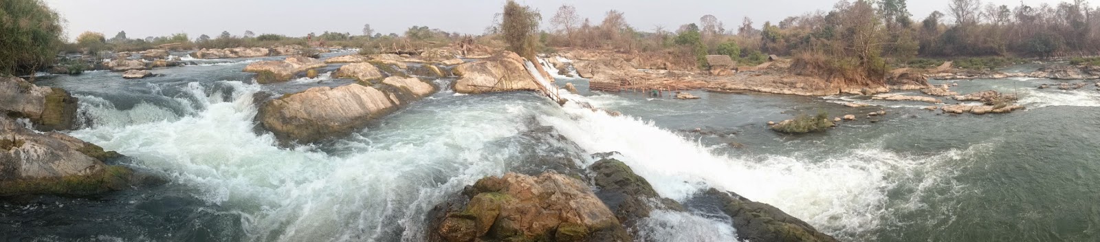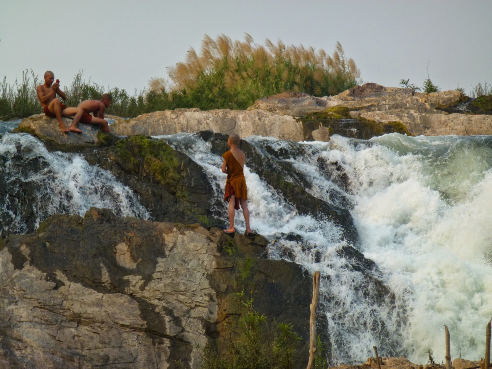 En la otra parte de la isla hay unos rápidos en el río bonitos de ver en unas cascadas, Khone Pa Soi, cruzando un puente colgante. Puedes bañarte, como estos jóvenes monjes con los que coincidí en lo alto de la catarata. Como ves, los monjes también se hacen selfies :)