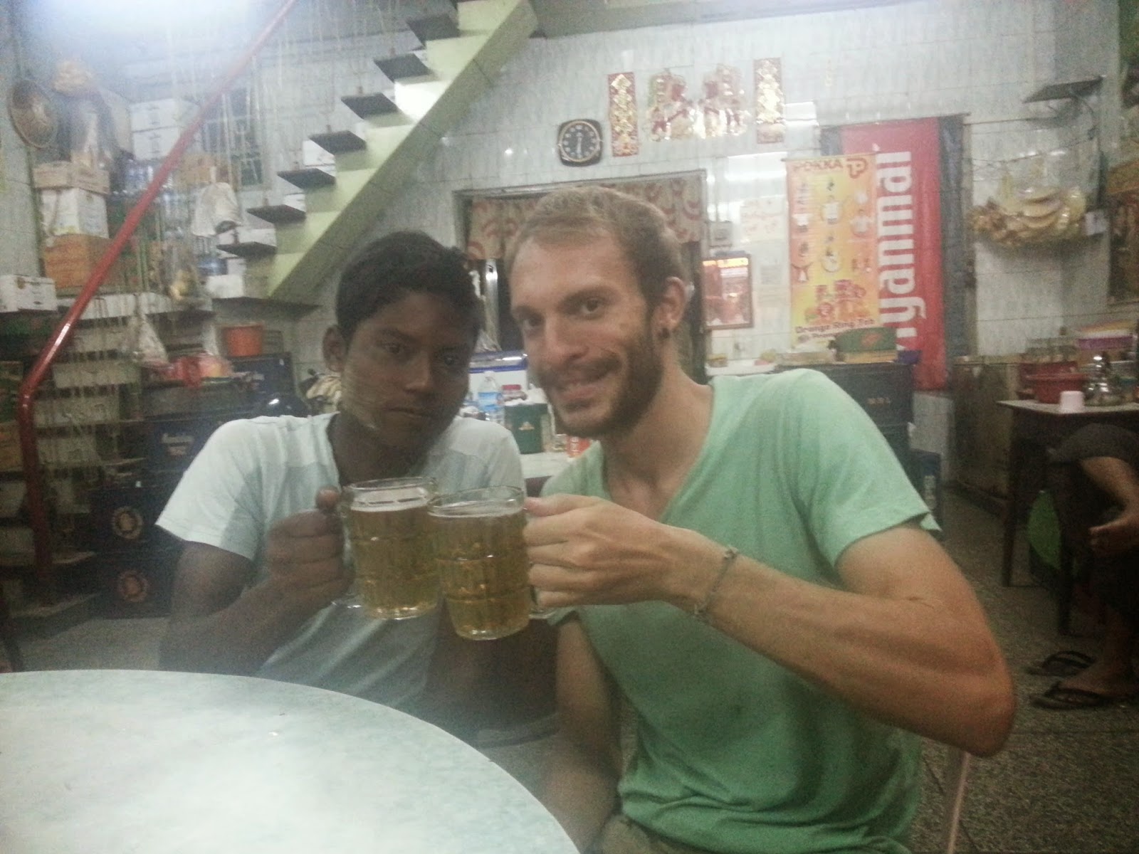 A la vuelta de Amarapura, comprando algo de comida «un poco rara» en un puesto callejero, hice un colega Birmano, Thura Aung, que me llevó a un bar típico de la zona y le invité a unas cervezas. No hablaba casi inglés, pero el idioma es lo de menos y pasamos un buen rato.
