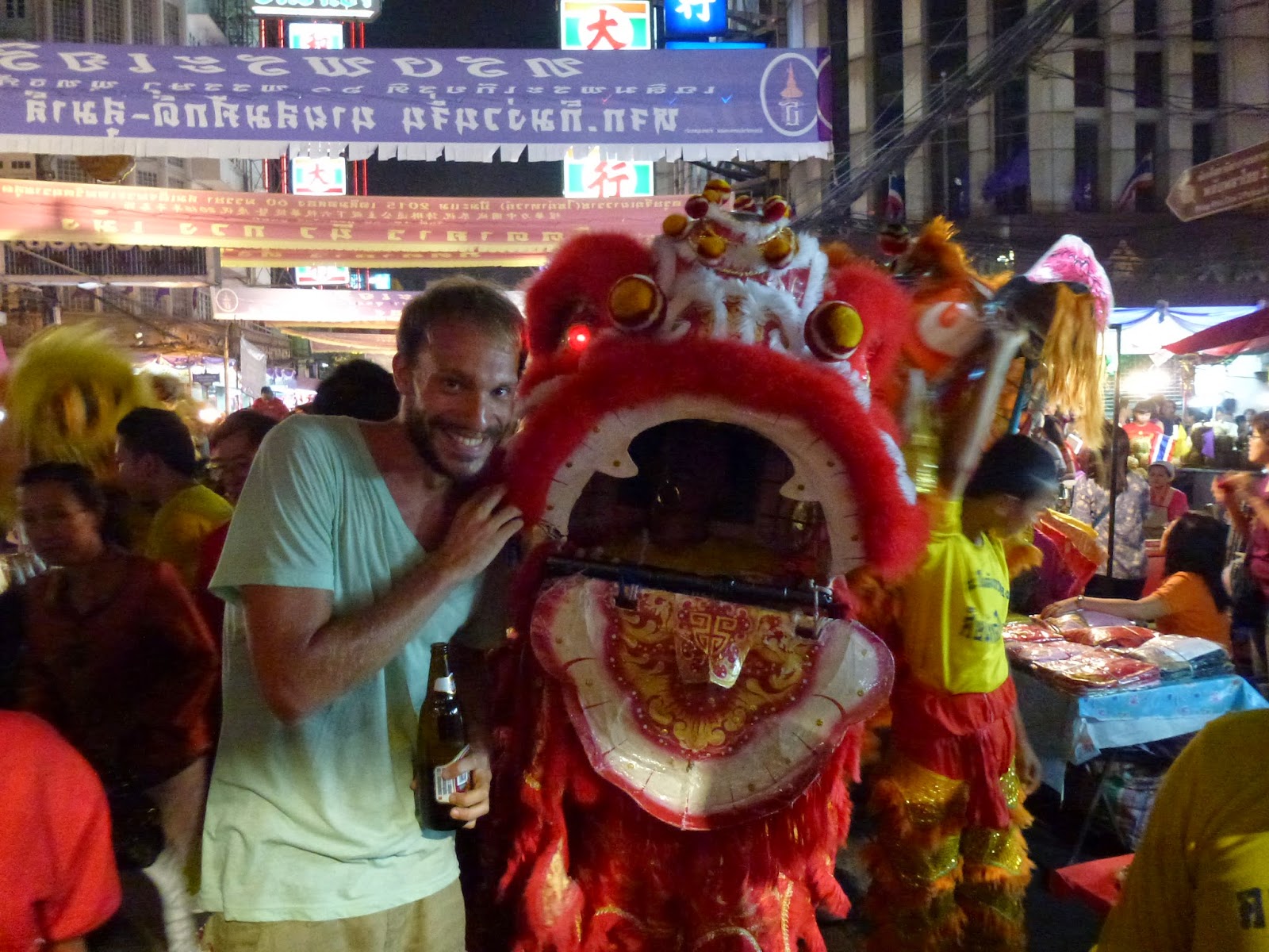 El propósito de ese pasacalles es introducir dinero – generalmente – en la boca del dragón para así tener suerte a lo largo del año que entra. Subo un vídeo donde se aprecia mejor, para que entiendas la que había montada ahí.