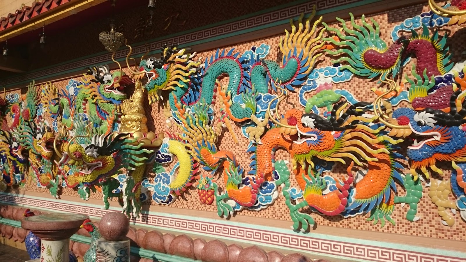 El plato fuerte durante el día son los dragones que recorren las calles, llevados por chavales jóvenes y animados con música, tambores, platillos… dando un color muy especial al evento.