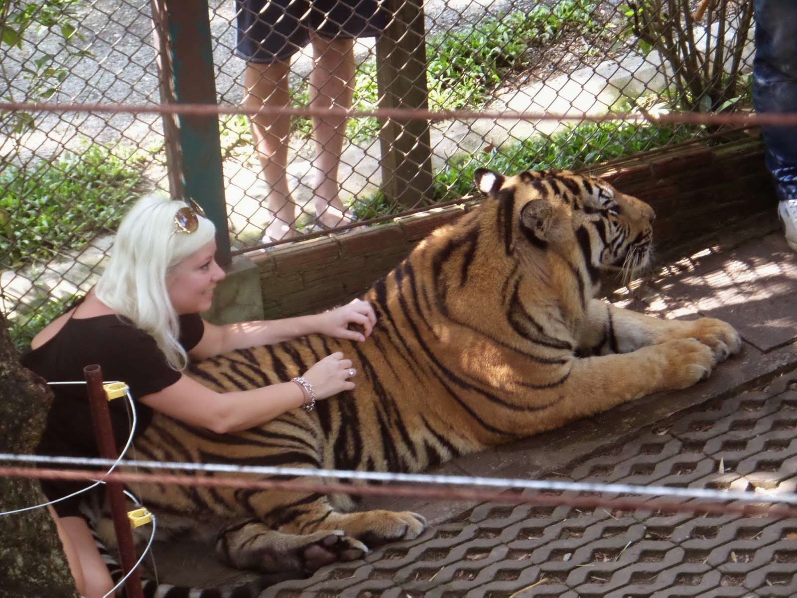 Al día siguiente, recorrí otro camino y me topé con un centro donde tienes la posibilidad de entrar en una jaula con tigres y hacerte fotos con ellos. Sin pagar entrada pude ver varias jaulas y cómo los tratan. Viendo lo que vi, comparto la teoría de que los drogan para usarlos de esta forma. ¡Son animales salvajes y prácticamente no se podían ni mover! Pobrecillos… Lo único positivo, que son preciosos, ¡enormes!