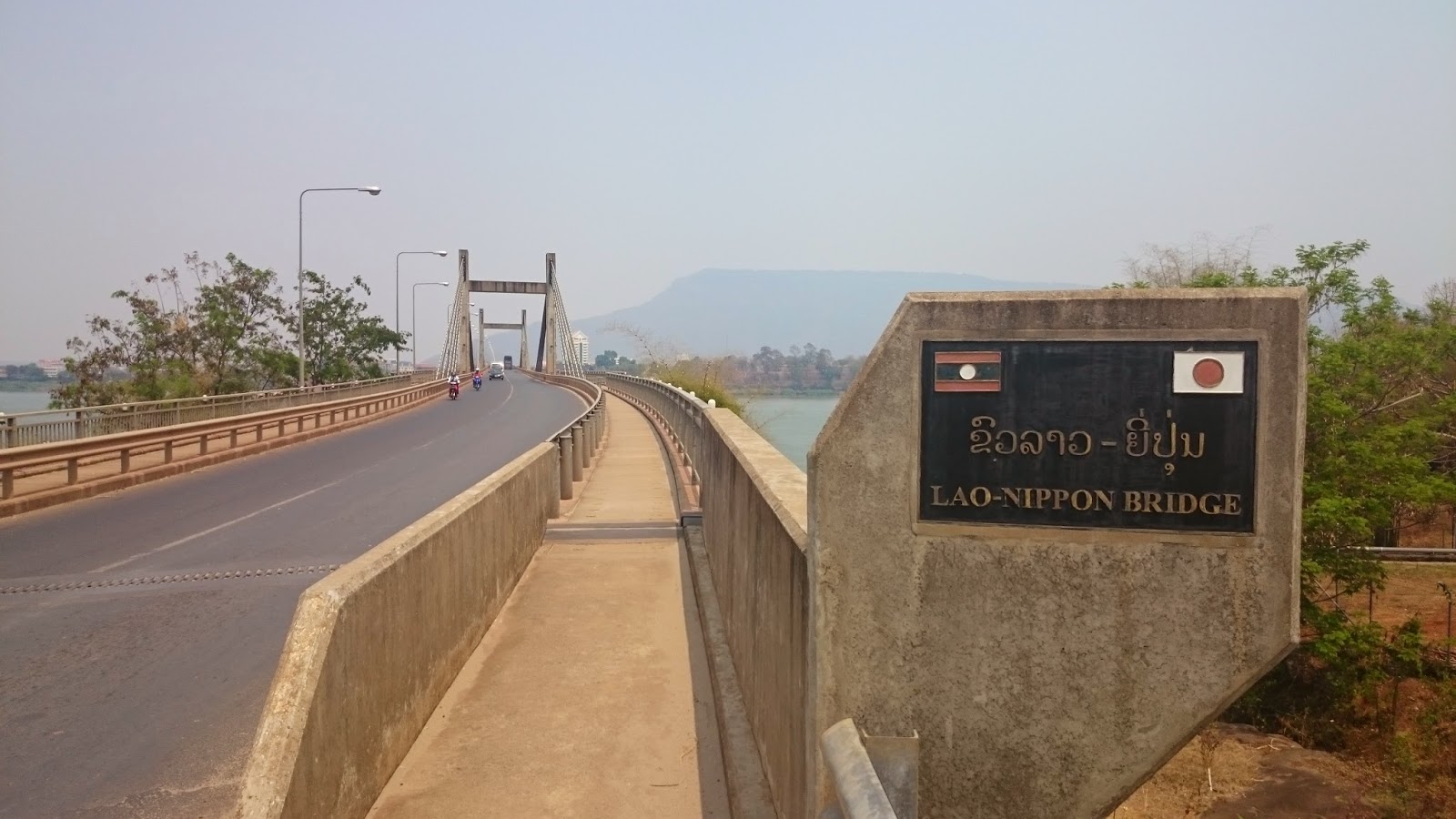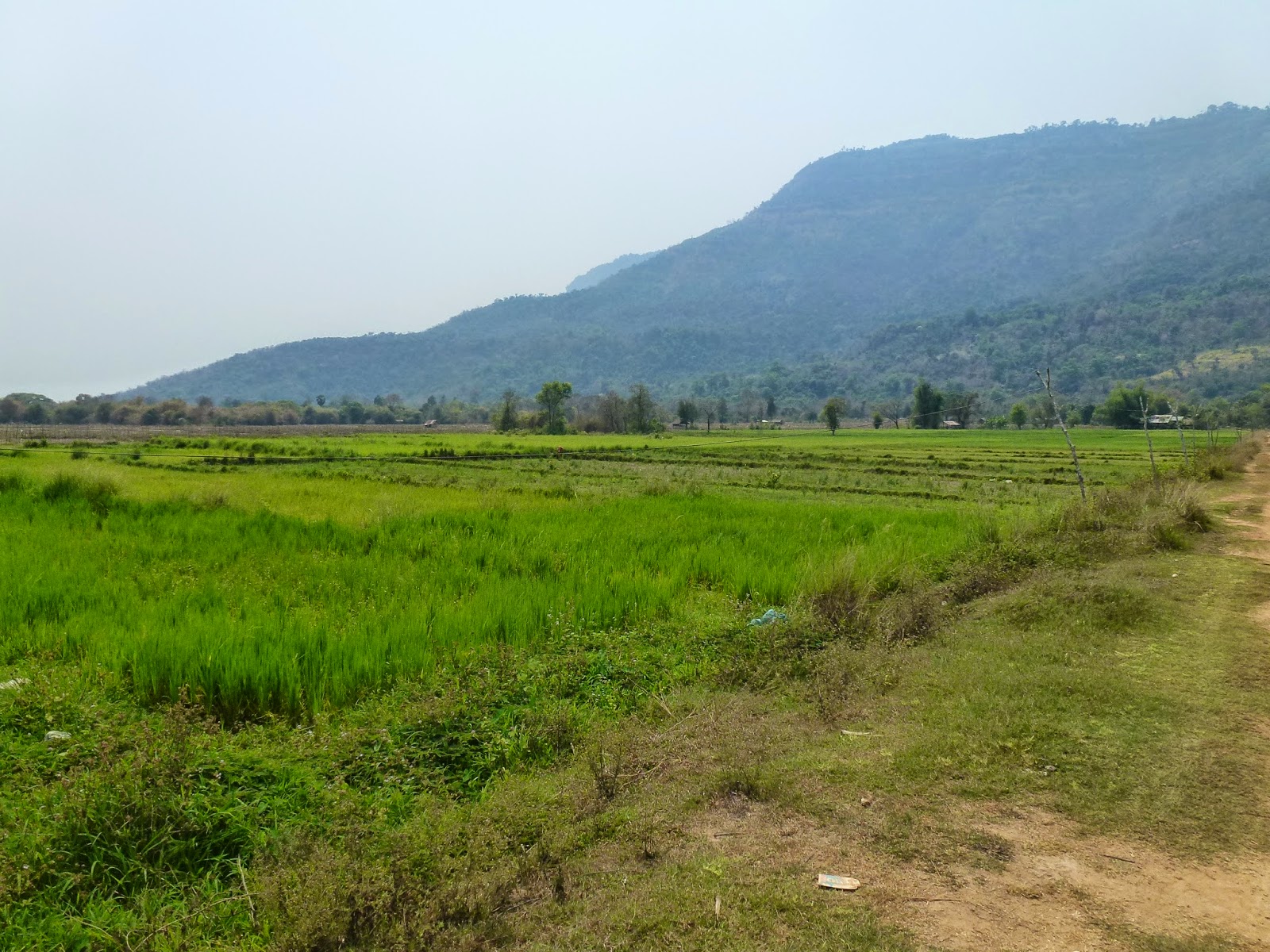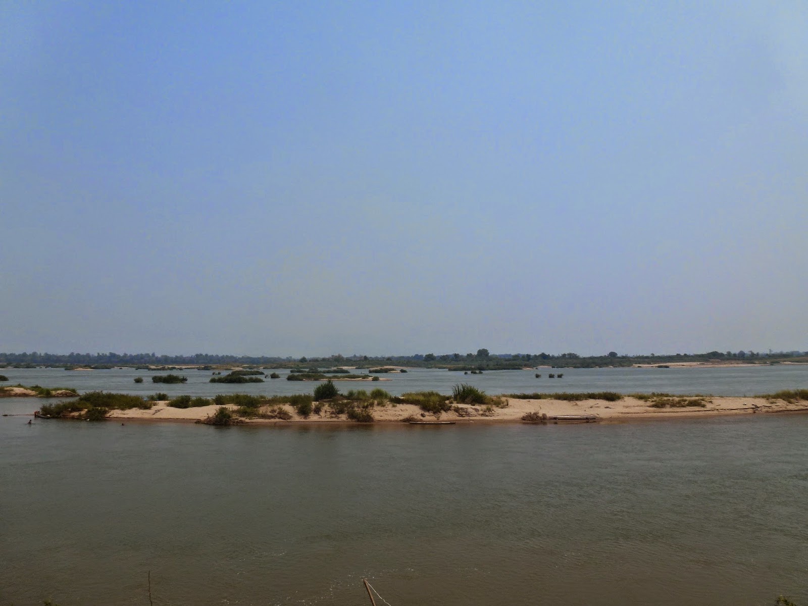 Todo el recorrido se realiza a la vera del inmenso e imponente Mekong. De vez en cuando me paraba en algún poblado y contemplaba las vistas desde la orilla. Al otra lado, verdes prados en un paisaje montañoso.
