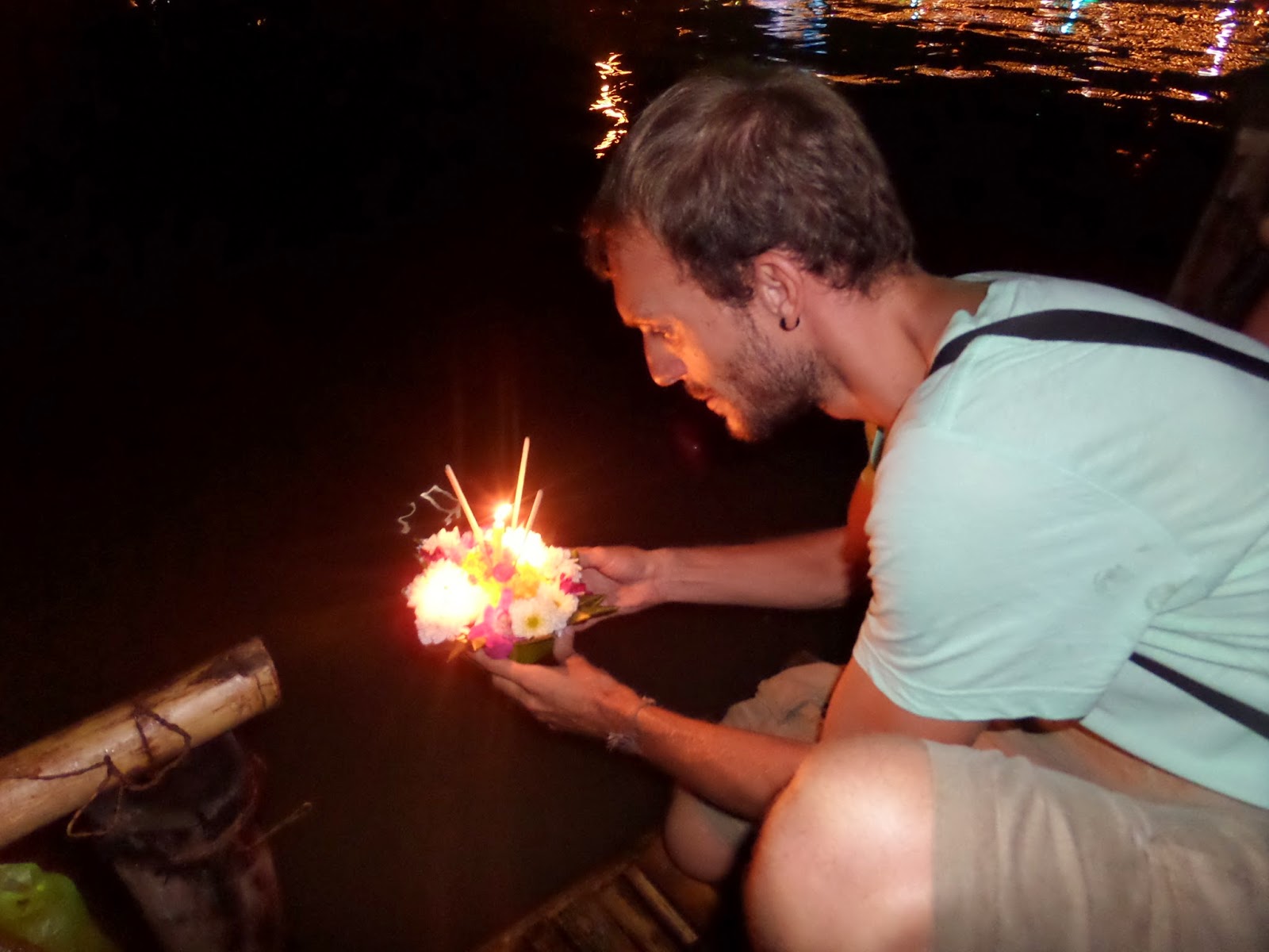 La base del Krathong es de tronco de banano, y luego se decora al gusto, con hojas de la misma planta, flores de diferentes colores, velas, incienso… Casualmente nos juntamos varios blogueros de viajes, como Analucía de Viajar para vivir o Felipe de Un viaje sin límites, y compartimos charlas de la comunidad bloguera que hay por la red. Claramente, el más bonito de todos los Krathongs fue el mio ;)