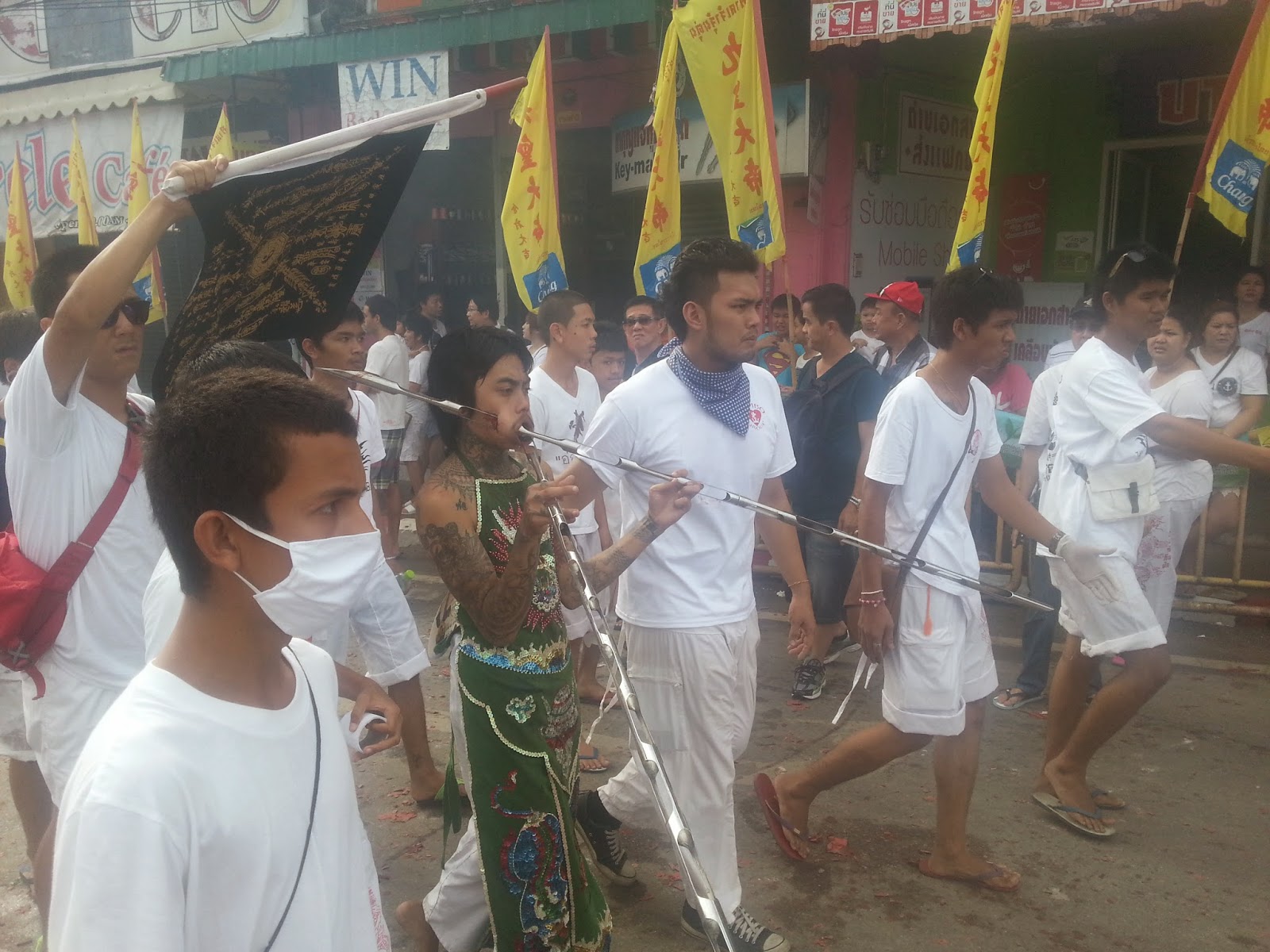 No he conseguido saberlo del todo, pero tiene que ver con creencias chinas y el no comer carne. ¿El por qué se clavan eso en el cuerpo? No le encuentro explicación….
