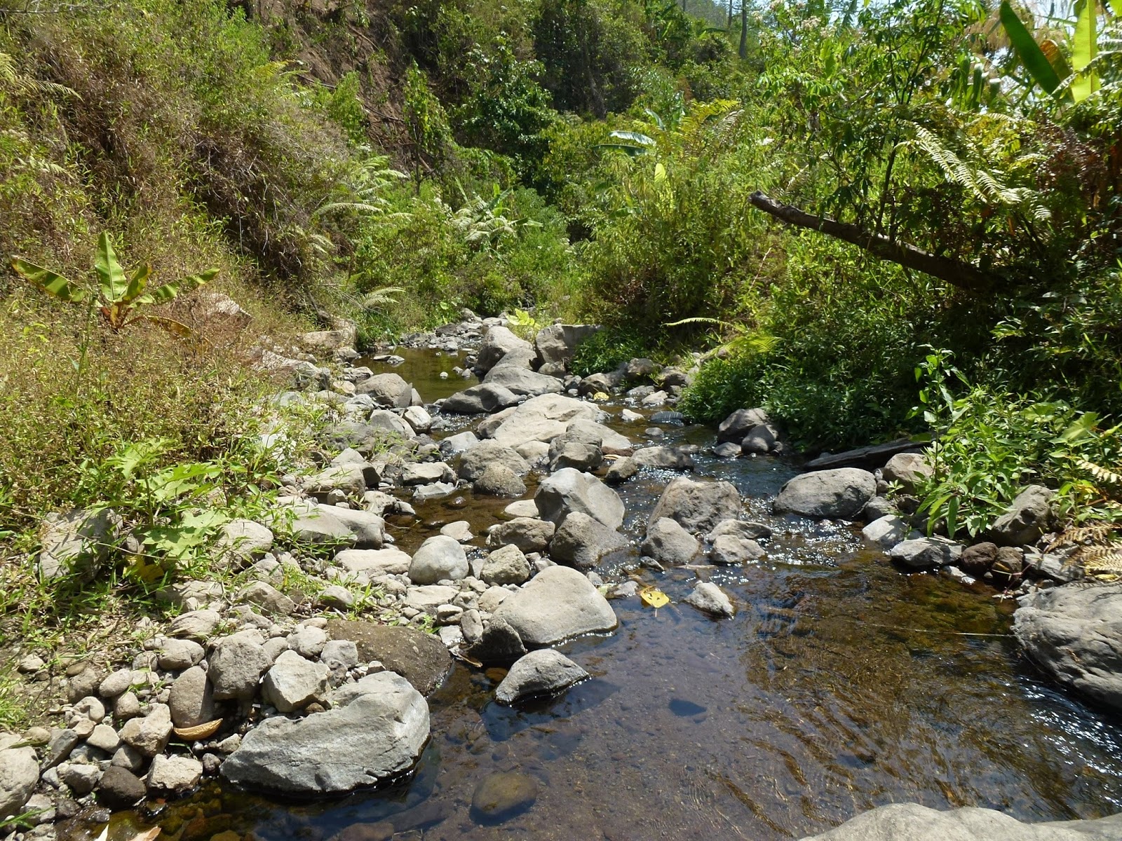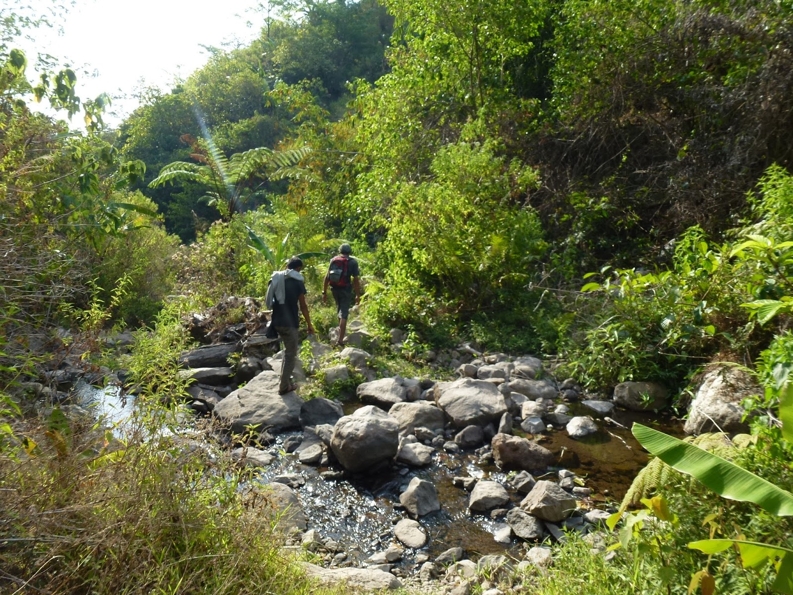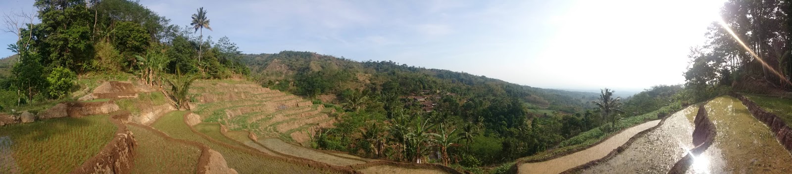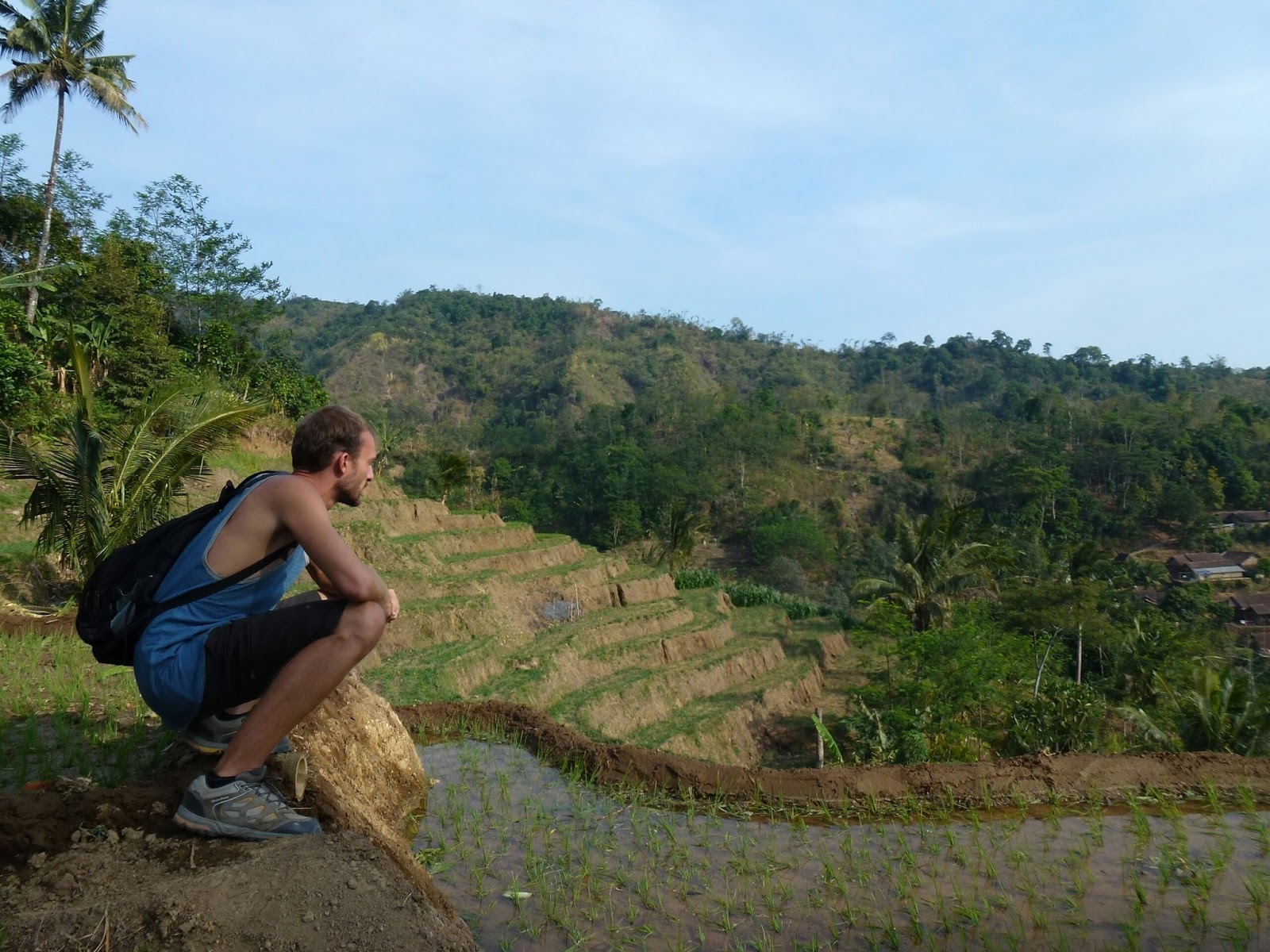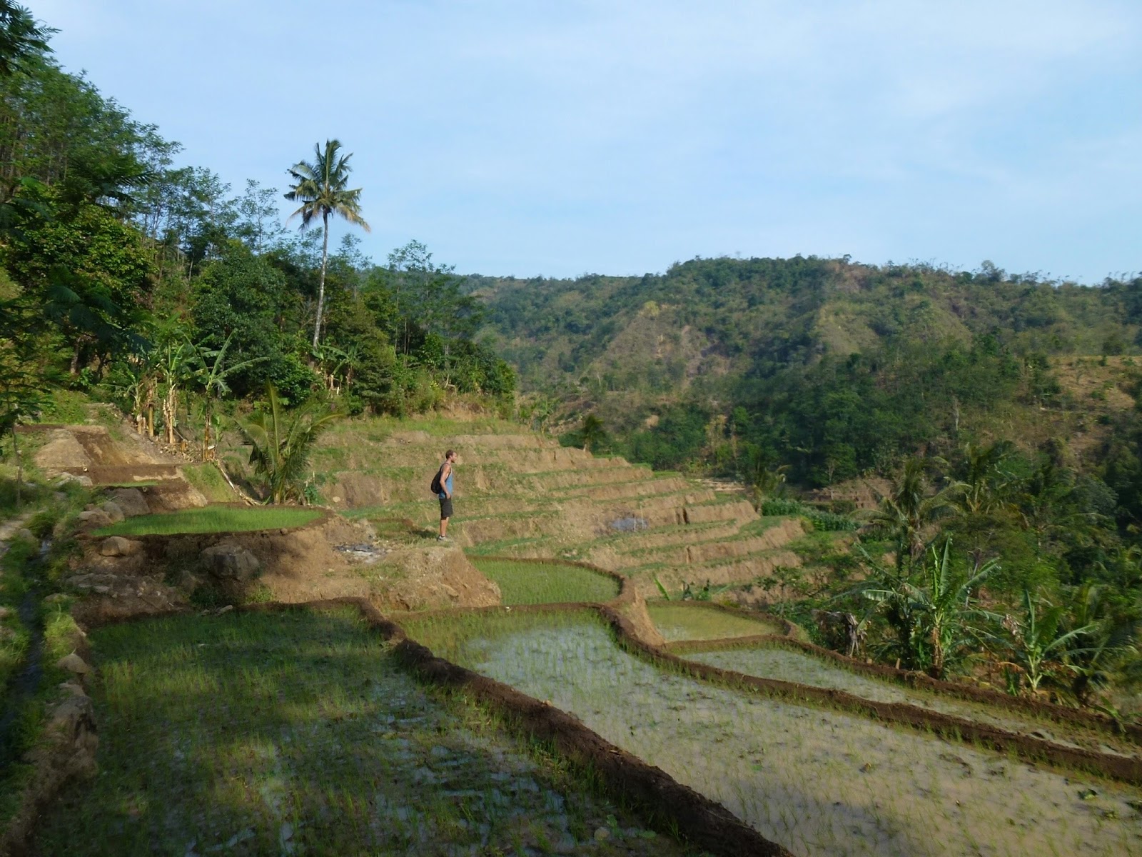«Está aquí al lado», decían. ¡Estos Indonesios son unos cachondos! Más de una hora de viaje atravesando ‘carreteras’ con unos agujeros de impresión, pueblos y montañas, con avería en la moto incluida, hasta llegar a una zona donde empezaríamos un trekking a través del río, campos de arroz y naturaleza en estado puro.