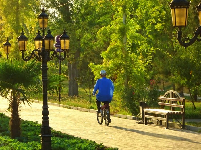 Un espacio perfecto para pasear rodeado de árboles y jardines a la vera del río Sir Daria.
