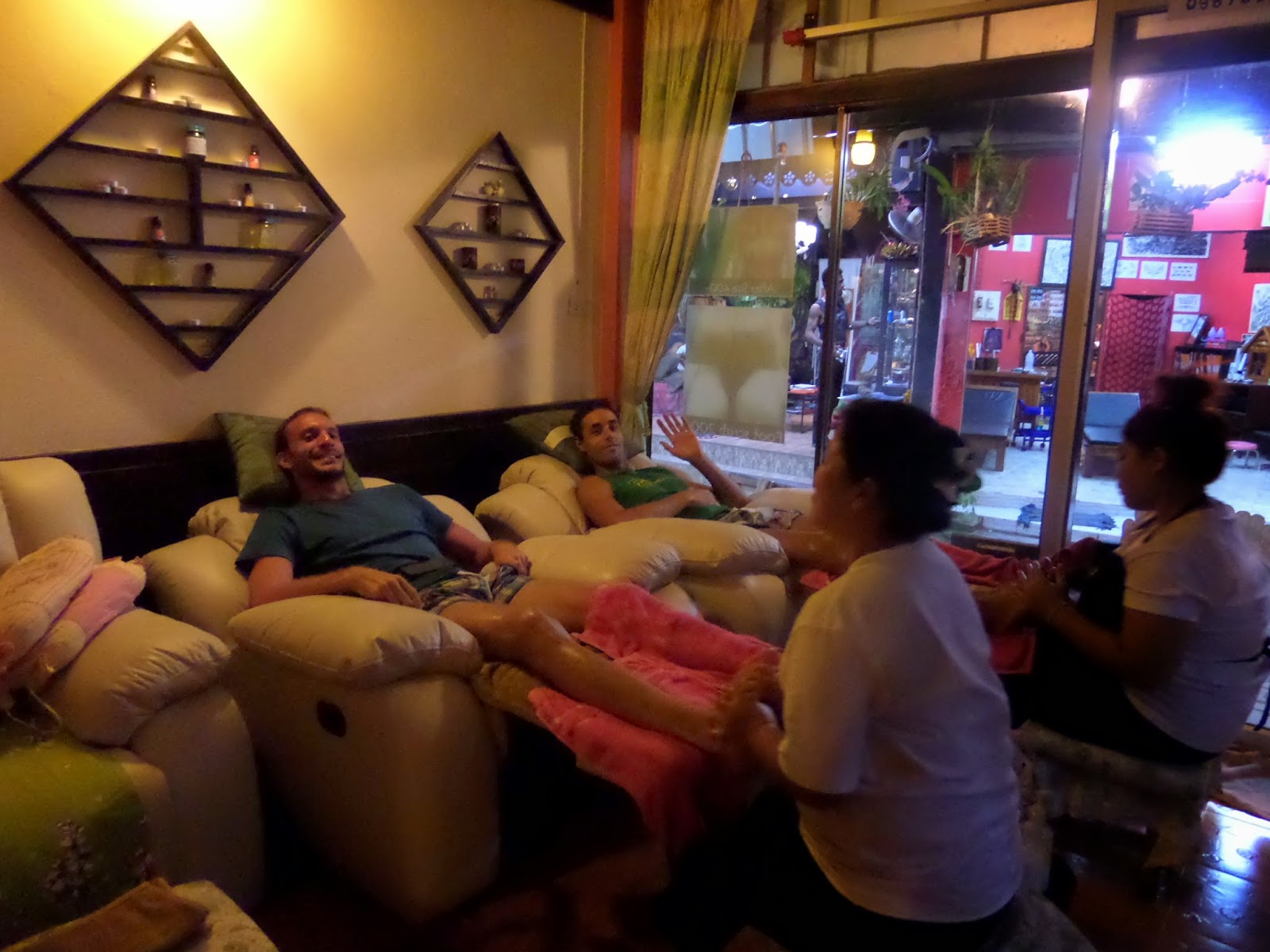 Después de la odisea para llegar a un mirador en el monte, donde se nos hizo de noche (me veía durmiendo con unos animales salvajes súper agradables…) nos merecíamos un masaje de pies y piernas. 1 hora, 5 euros. Salimos como nuevos.
