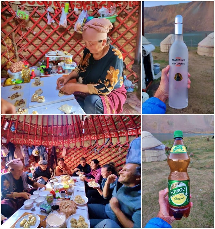 Antes de dormir, los pocos viajeros que llegamos ese día hasta allí compartimos con los nómadas de la zona una cena tradicional en una de las yurtas, cerveza local y varios chupitos de vodka, que en Kirguistán siempre caen. Cómo les gusta el vodka a los kirguís… :)