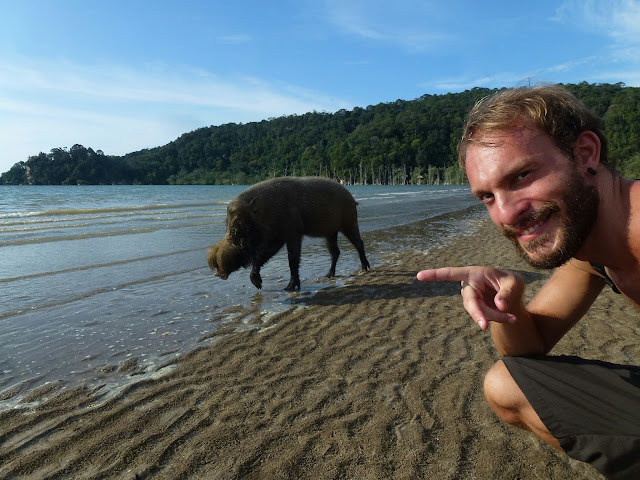 Al ser un paisaje selvático, es normal cruzarse con todo tipo de animales salvajes. Serpientes, iguanas, monos narigudos o el que más gracia me hizo a mí. El cerdo salvaje -o jabalí barbudo-. Es toda una sorpresa ir andando por la playa y encontrarte semejante ejemplar. Hay muchos cerca de los alojamientos y parecen bastante inofensivos.