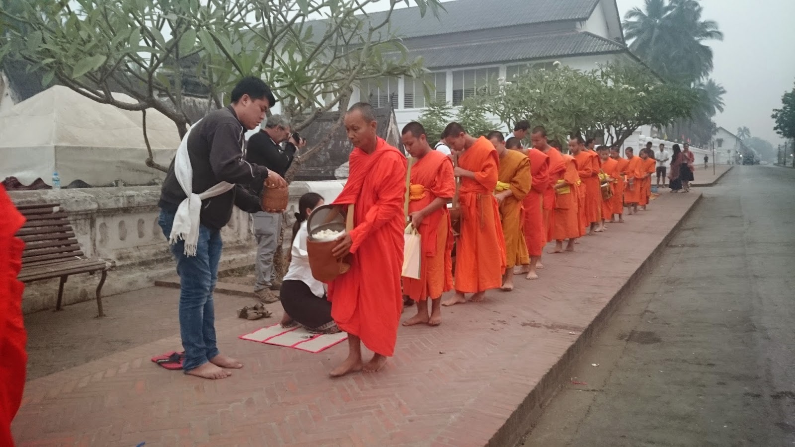 Una ceremonia antiquísima se ha convertido en actividad turística obligada en Luang Prabang. Esta es madrugar, a las 5:30 empieza, para ver cómo los fieles -y turistas si quieren participar- entregan a los monjes sus ofrendas de limosnas, generalmente arroz. Es una tradición que se celebra en muchos más lugares budistas, pero aquí ha tomado un giro más turístico que otra cosa. En Myanmar vi algo parecido pero sin ningún turista alrededor. Aun así, creo que merece la pena ver un acontecimiento de este tipo.