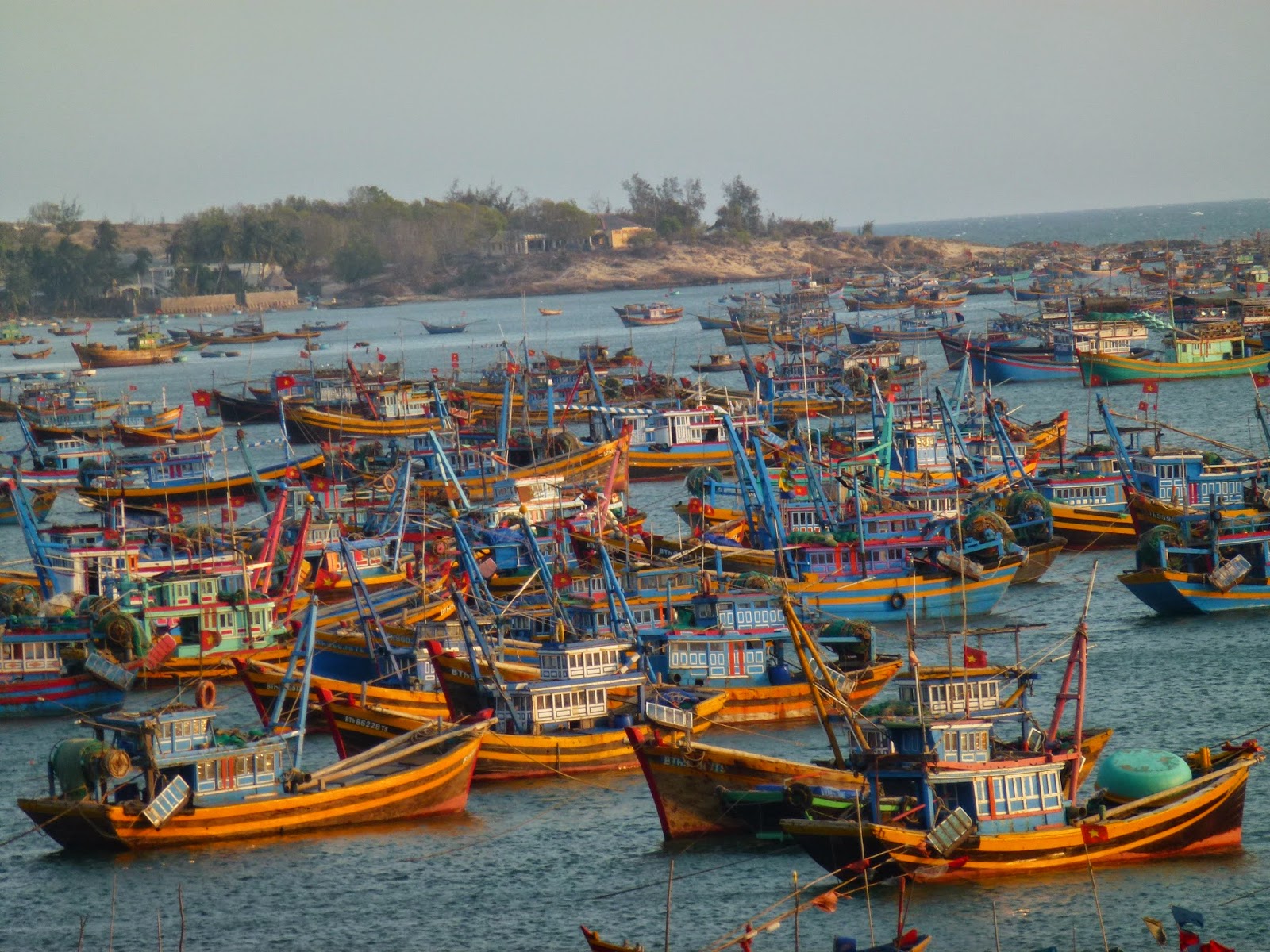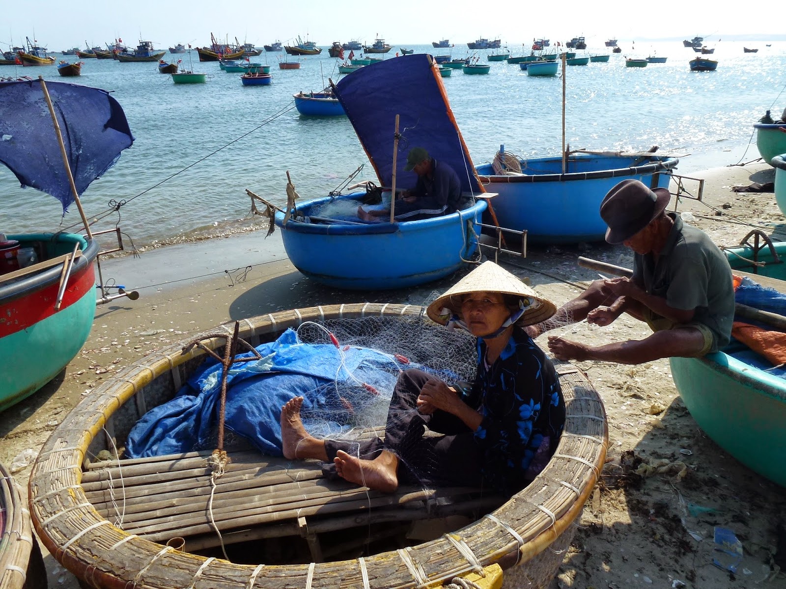 No recuerdo haber visto un pueblo de pescadores tan bonito como el de Mui Ne. Cientos, por no decir miles de barcos en el mar que dibujan una imagen propia de postal o de portada de guía de viajes. Barcos de todos los tamaños y colores. Muchos de ellos son una especie de barco circular más pequeño, típico de la zona. Muy curioso.