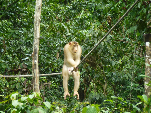 Los pobres orangutanes tiene que lidiar día si día también con los monos que andan a la espera de un despiste para robarles la comida. Cada vez me caen peor estos macacos… Este, por cierto, era de los grandes. ¡Vaya bicho y vaya fuerza!