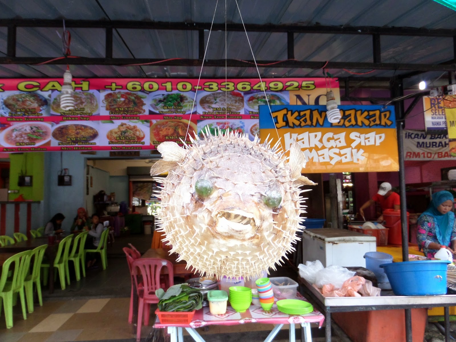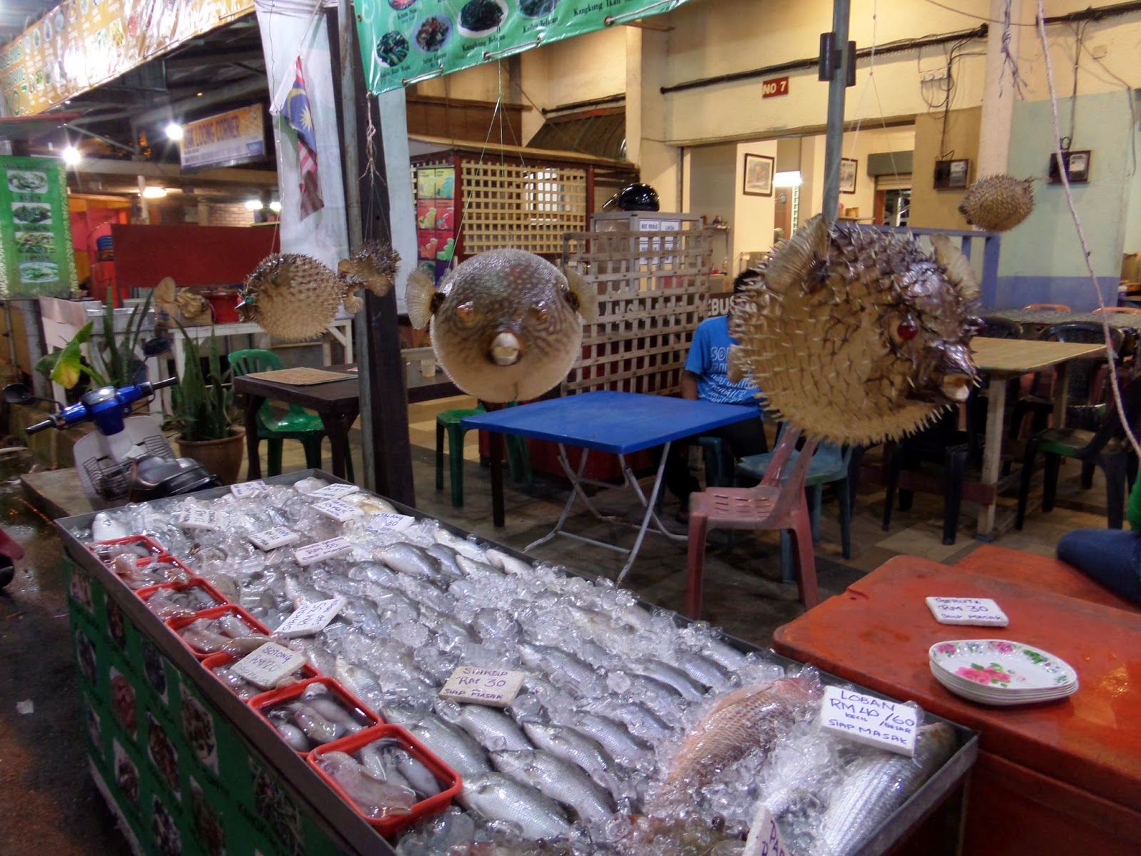 Se come muy bien en Pangkor. Mi predilección, el Nasi Goren Village. No picante, por supuesto. Muchos restaurantes y mucho pescado fresco, aunque bastante más caro. Y colgando peces disecados que, la verdad, daban un poquito de mal rollo…