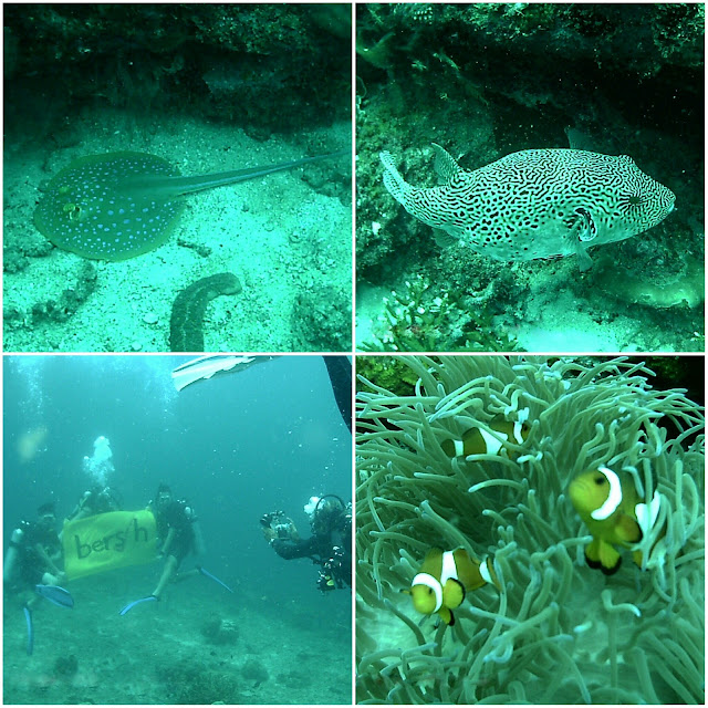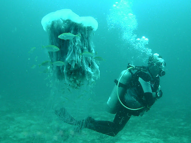 Después de tantas inmersiones, hay que reconocer que el listón está cada vez más alto, pero disfruto de cada buceo al máximo. El instructor era un crack y eso ya ayuda a que el ambiente gane enteros. Pero en este caso la visibilidad no era la mejor aunque pude ver gran cantidad de rayas y lo que más me sorprendió: ¡Medusas de mi tamaño! Atención a la foto que tomé de una de ellas junto a otro buceador. Impresiona, ¿verdad?