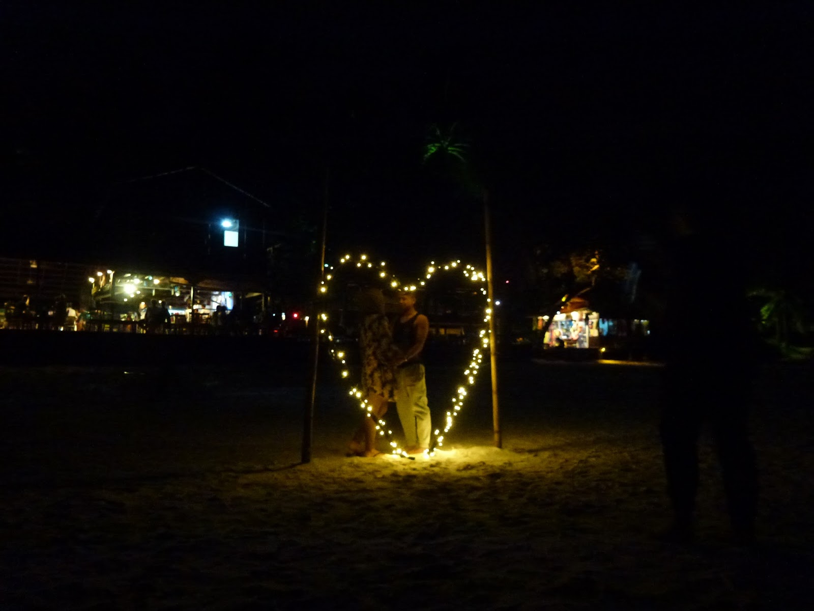Por la noche el ambiente se centra en los bares de los resorts. No esperes fiestones locos. Música en vivo a pie de playa es la tónica general. Luego te ponen un corazón gigante con lucecitas y la gente se vuelve loca para hacerse fotos con él.