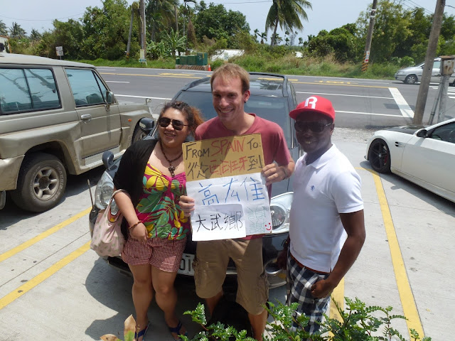 Al ser una distancia tan grande no tenía muy claro si llegaría en el mismo día a Kaohsiung, pero después de 6 coches y cuando todavía quedaba mucho tramo por recorrer, apareció una pareja, él de Costa de Marfil ella taiwanesa, que viven en Taipei y estaban pasando el fin de semana de vacaciones, con lo que no solo me llevarían hasta Kaohsiung, sino que iríamos parando en diferentes lugares haciendo un poco de turismo juntos. ¡Plan perfecto!