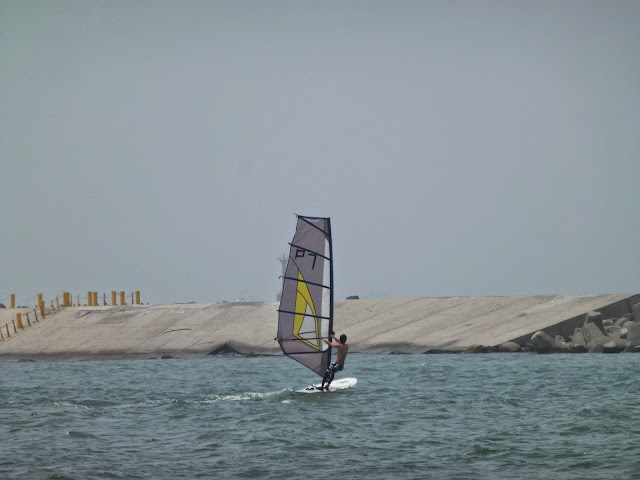 Una vez abajo de nuevo me dirigí a la playa de la ciudad. Vamos a ver, playa es. Otra cosa es que invite al baño, que la verdad no mucho. Arena negra y lo único que encontré fue una persona pescando y varios windsurfistas. Evidentemente no es zona de playa, es más de puerto y pesca. En el islote de enfrente se encuentra el faro de la ciudad.