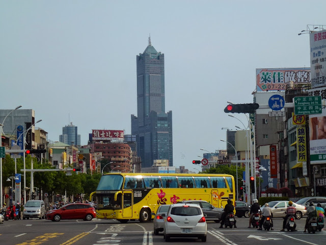 Al día siguiente de llegar el tiempo no acompañó, pero me acerqué al Tuntex Sky Tower. 85 pisos y 375 metros hasta su punto más alto. Este es edificio más alto de la ciudad, el segundo más alto del país desde que construyeron el gigante Taipei 101 en la capital y anda entre los 50 más altos del mundo. Esa forma tan característica tiene su explicación. Está inspirado en el caracter chino 高, que significa «alto», y a su vez es el principio del nombre de la ciudad 高雄. ¡A mi me recuerda a una pieza del Tetris pero bueno!