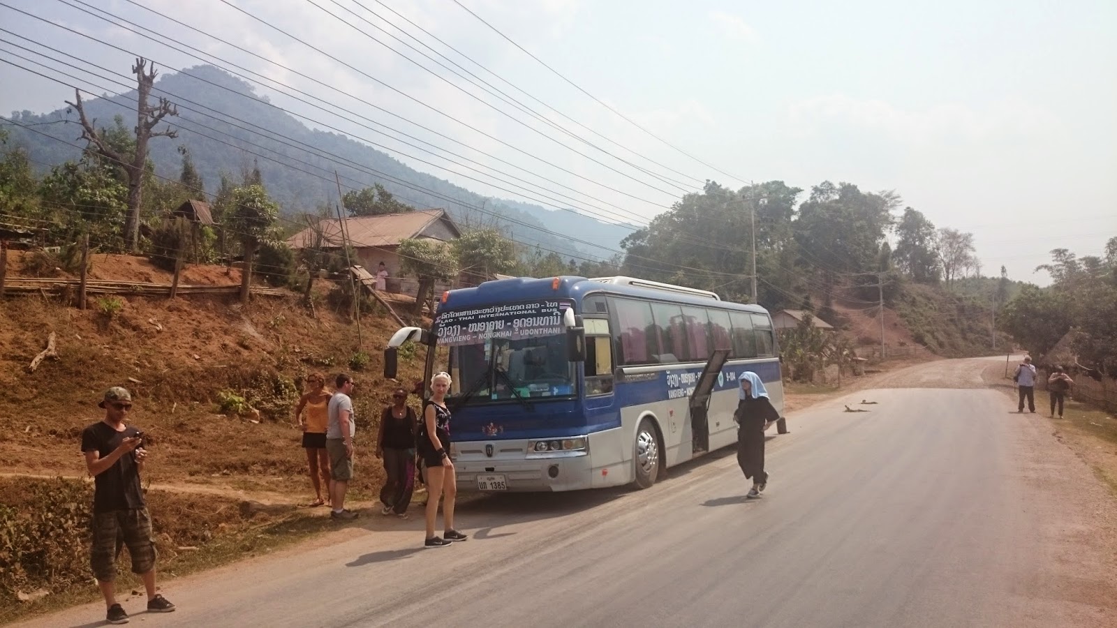 Si el llegar a Vientiane fue un suplicio, el salir de Vientiane no se queda atrás. A mitad de camino de mi siguiente destino, el bus que nos llevaba se rompe. 1 hora parados en medio de la nada. «Teóricamente» lo arreglan pero al rato de nuevo otro parón.
